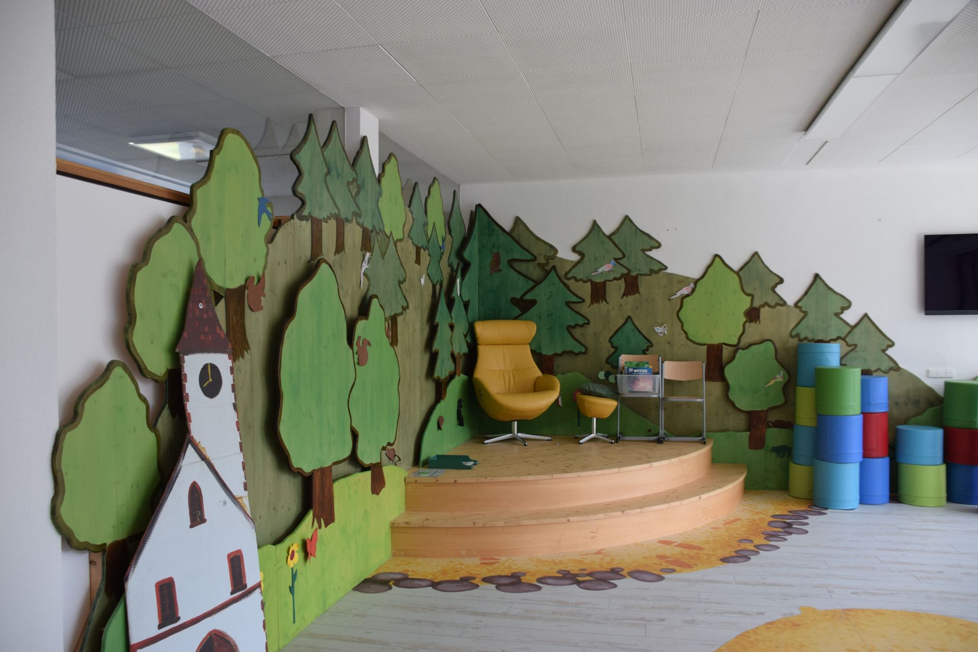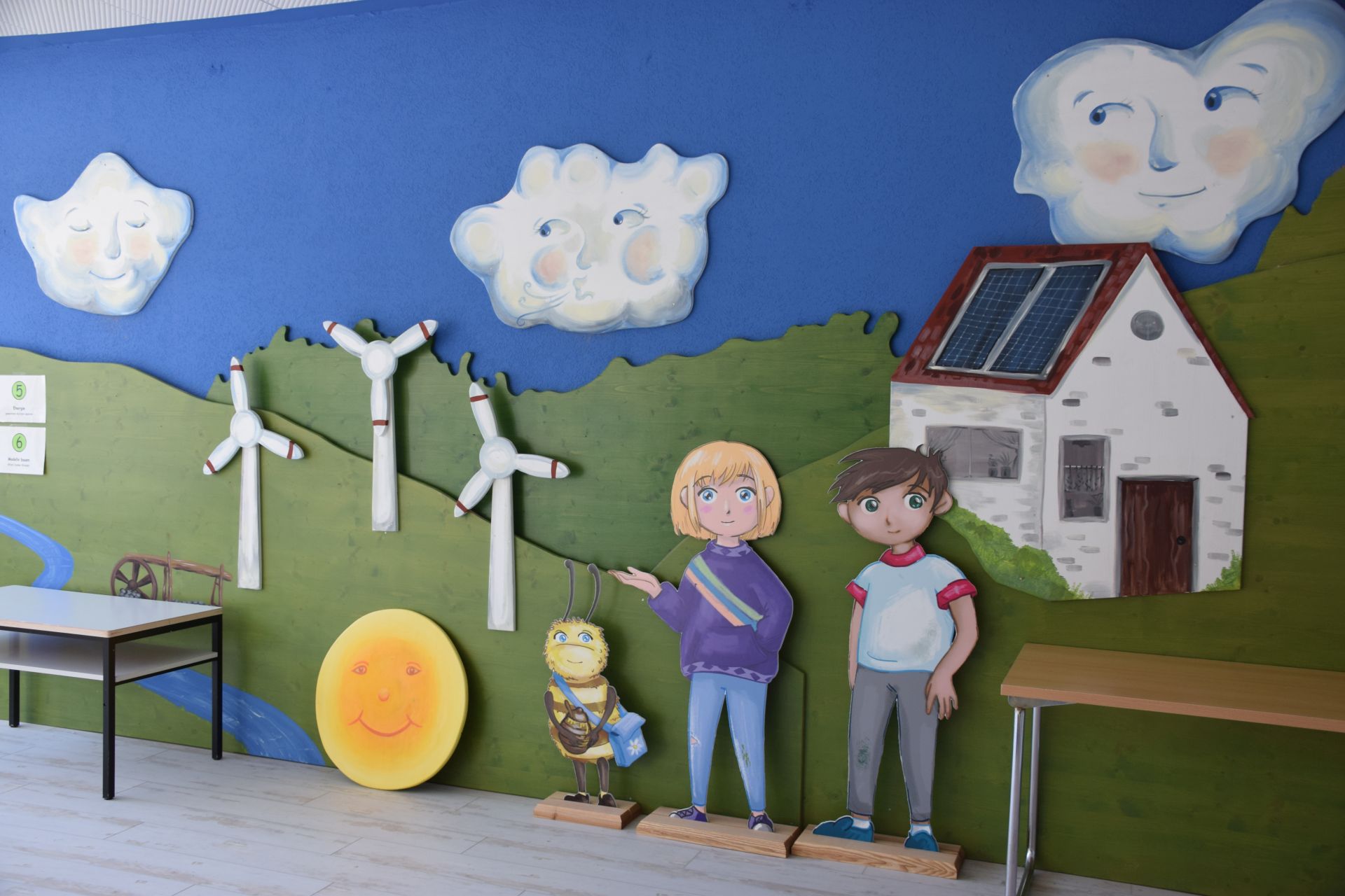 …Zum Thema Klima und Energie können die Lehrerinnen ein Flipchart und eine Pinn-Wand nutzen um beispielsweise die schuleigene Photovoltaik-Anlage mit den Kindern zu thematisieren. Alle Bereiche sind passend und liebevoll mit Wand-Bildern bemalt…