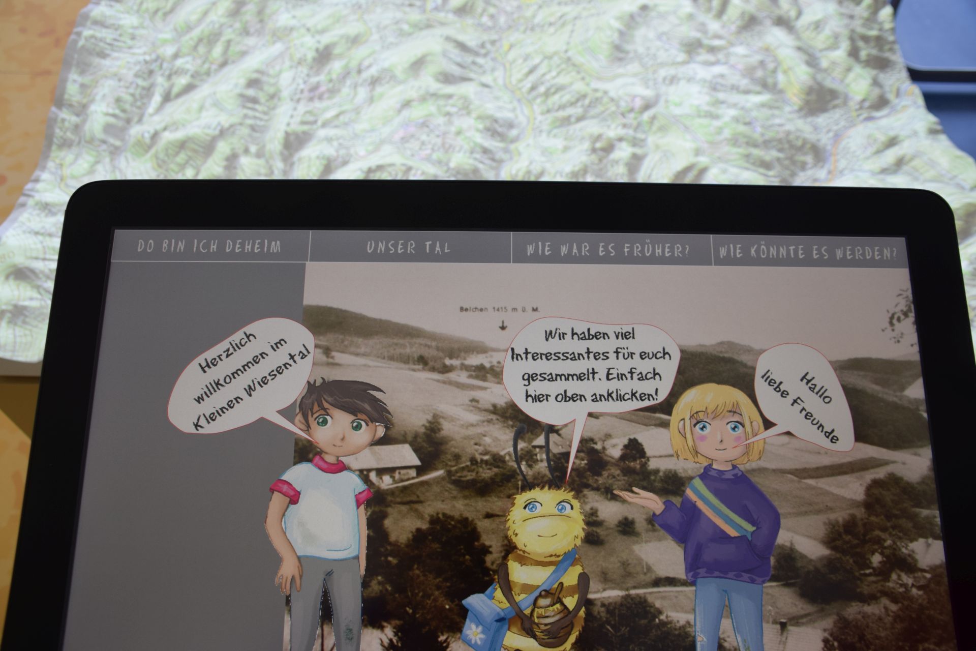 …Das Modell enthält topographische Elemente wie Ortschaften, Wege, Berge und Sehenswürdigkeiten. Audio-Tracks mit Anekdoten aus den Dörfern werden von den Kindern gesprochen und aufgenommen…