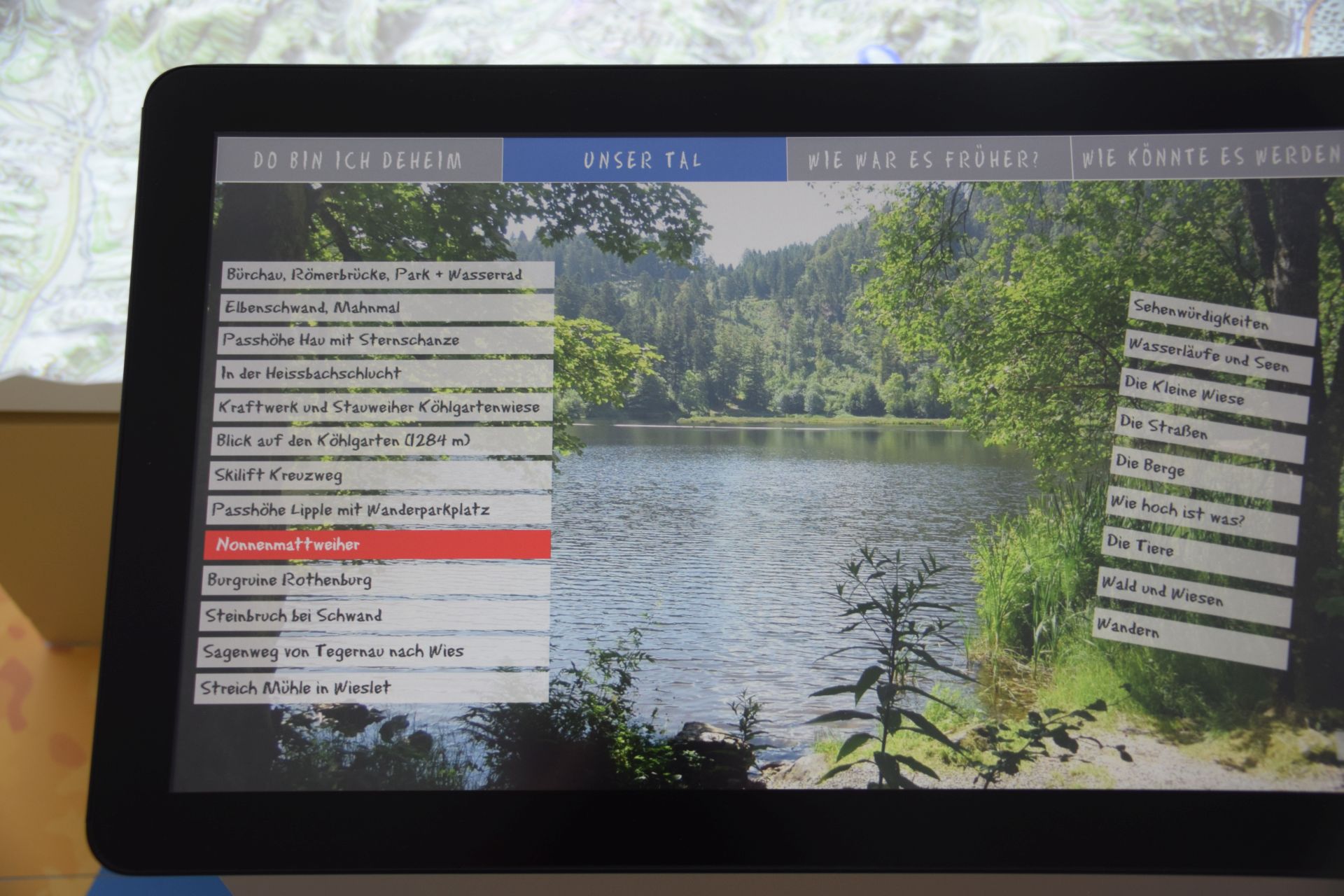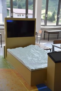 …Die Raumgestaltung beinhaltet einzelne Themen-Ecken. Ein Geländemodell ist das Kernstück des Raumes. Themenbezogene Szenarien können von Kindern und Lehrkräften auf wahlweise hochdeutsch und auf alemannisch bespielt werden…