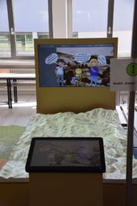 …Es gibt eine gemütliche Erzählecke mit Sessel und Hockern für den historisch – kulturellen Bereich und eine Ecke mit Equipment wie Mikroskopen und Forschungs-und Bastelmaterialien für den Natur-und Umweltbereich…